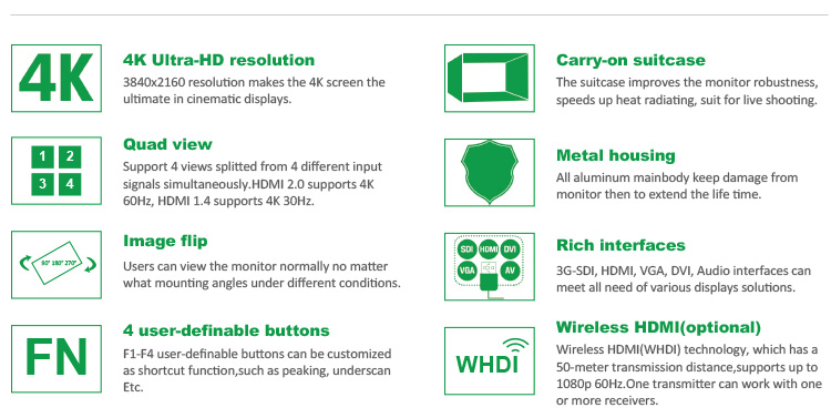 Input : 3G-DSI x 1, DVI x 1, VGA x 1, Audio (R/L), Tally x 1, HDMIx2.0 x 1 (Support 4K 60Hz), HDMI1.4 x 3 (support 30Hz), Wireless HDMI x 1 (Optional)