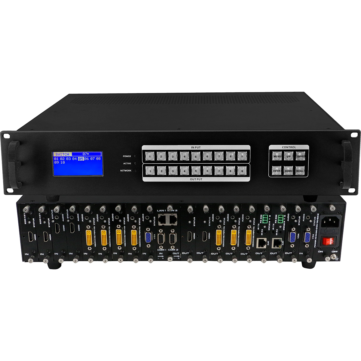 This is a modular matrix switcher, with 9 input slots and 9 output slots, so it can support maximum 9 inputs and 9 outputs, all the input and output cards are using 1-card 1-port, the signals are including the DVI, HDMI, HDBasT, Fiber Optic, 3G-SDI. Users are able to have mixed signals inputs and mixed signals outputs.